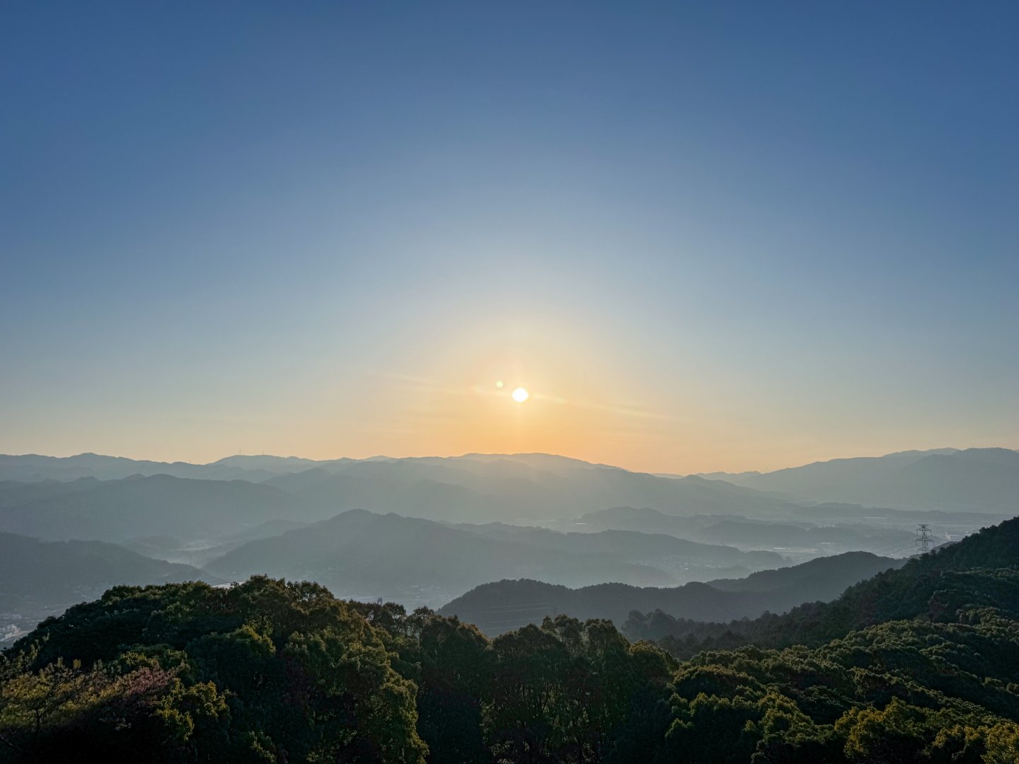 でも、最初のピークまで登ったとき、まだ朝の光が山と街をやわらかく照らしていました。遠くに広がる街、重なる山の稜線、その向こうから放射状に差し込む光。その瞬間、胸の奥がじんわり熱くなりました。完璧なタイミングではなかったけれど、ちゃんと自分の足でここまで来て、この景色を見ている。その事実だけで十分でした。ああ、ひとつ叶えたんだなと思いました。